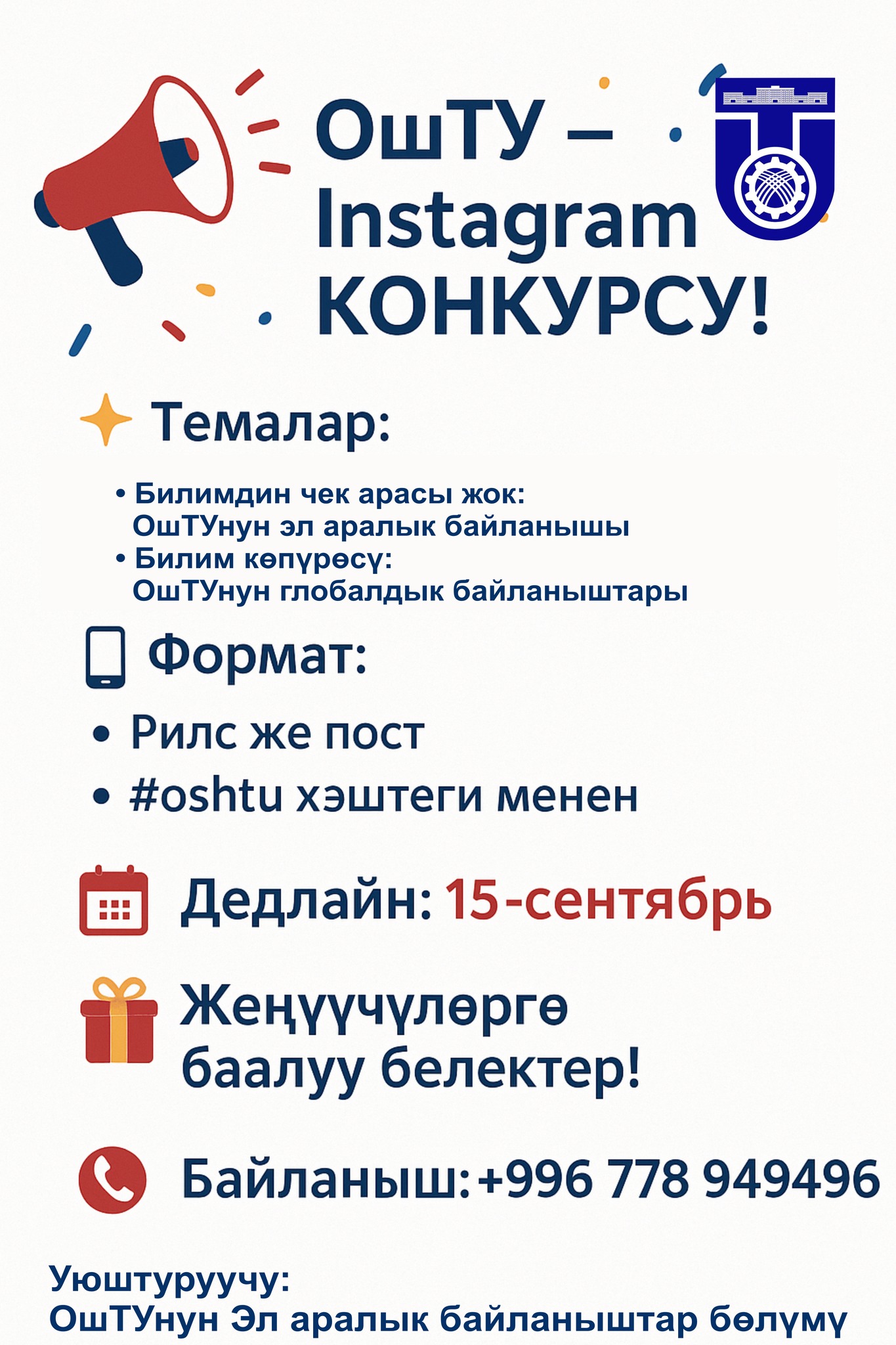 М.М. Адышев атындагы Ош технологиялык университетинин Эл аралык байланыштар бөлүмү Instagram платформасында студенттер үчүн конкурс жарыялайт