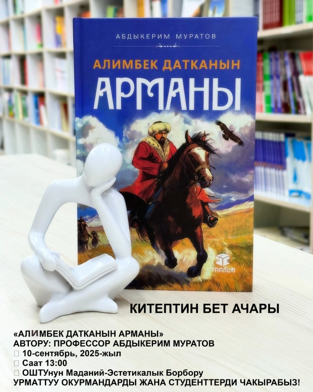 Ош технологиялык университетинде Кокон хандыгынын белгилүү мамлекеттик ишмери, тарыхый инсан Алымбек датка Асан бий уулунун 225 жылдыгына карата жазуучу, публицист, педагогика илимдеринин доктору, профессор Абдыкерим Жаркынбаевич Муратовдун жаңы эмгеги — «Алимбек датканын арманы» аттуу китебинин бет ачары өтөт.