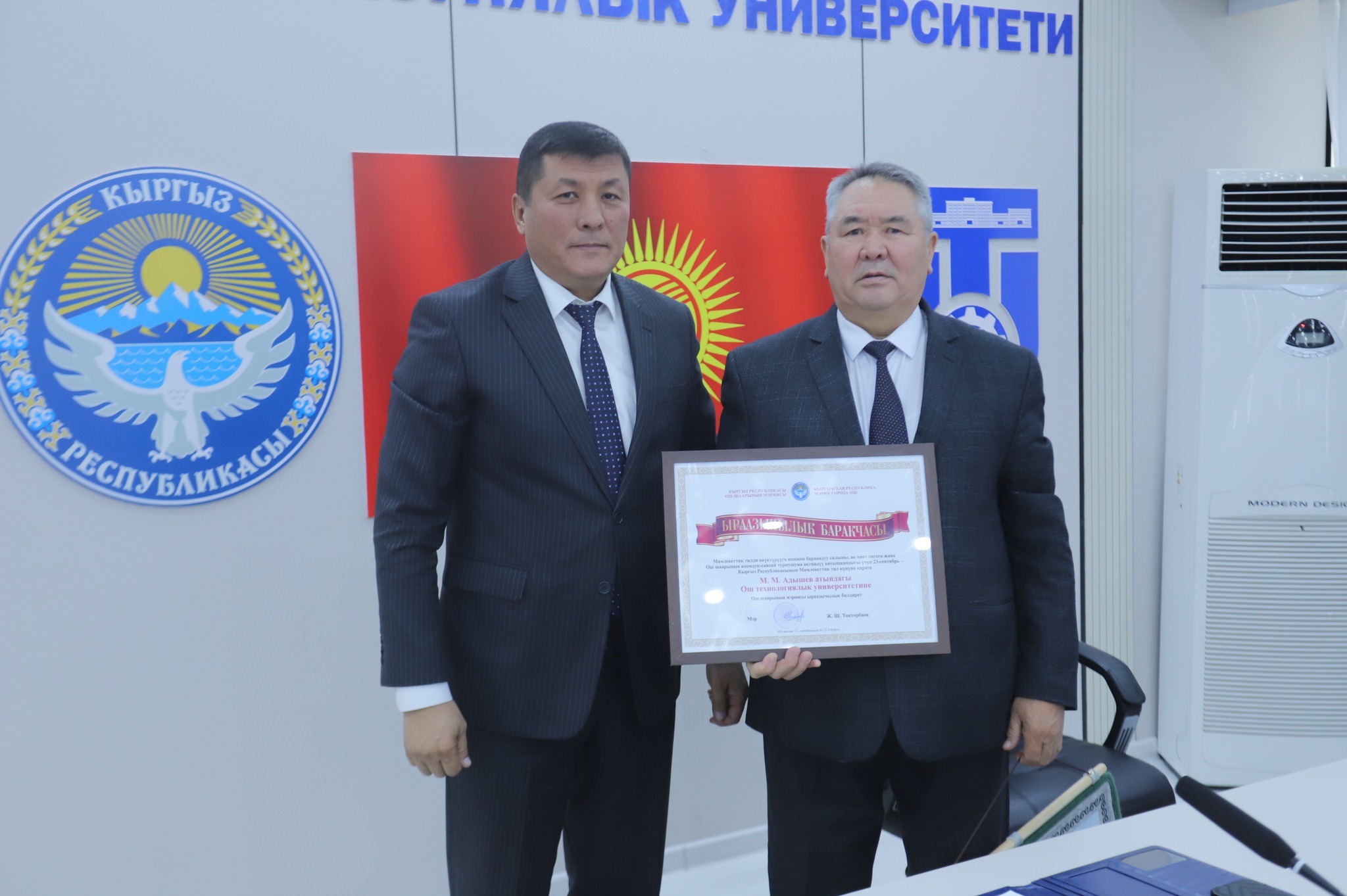 Мамлекеттик тилдин 36 жылдыгына карата Ош шаардык мэриясы тарабынан уюштурулган салтанаттуу иш-чарада Ош технологиялык университети мамлекеттик тилди өнүктүрүүгө кошкон салымы үчүн Ош шаарынын мэри Жеңишбек Токторбаевдин атынан ыраазычылык каты менен сыйланды.