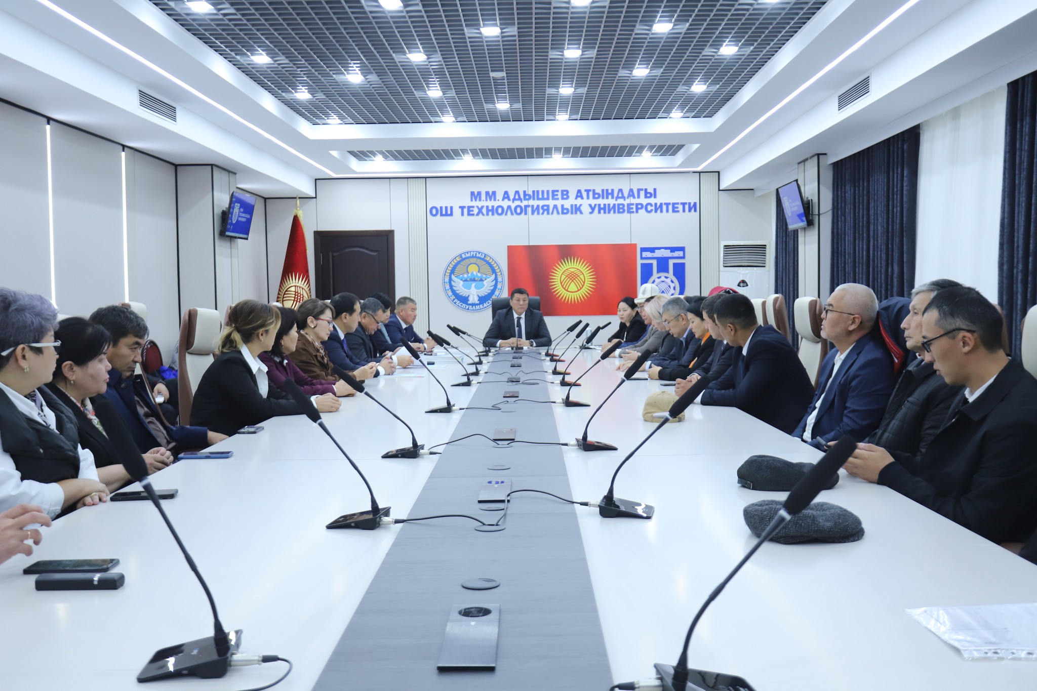 Аккредитациянын алкагында эксперттик топ университеттин жетекчилиги менен жолугушуп, окуу жайдын ишмердүүлүгү жана жетишкендиктери тууралуу маалымат алышты. ОшТУнун ректору, профессор Жанболот Турсунбаев университеттин тарыхы, стратегиялык максаттары жана билим берүүнүн сапатын жогорулатуу боюнча жүргүзүлүп жаткан иштер тууралуу кеңири баяндама жасады.
