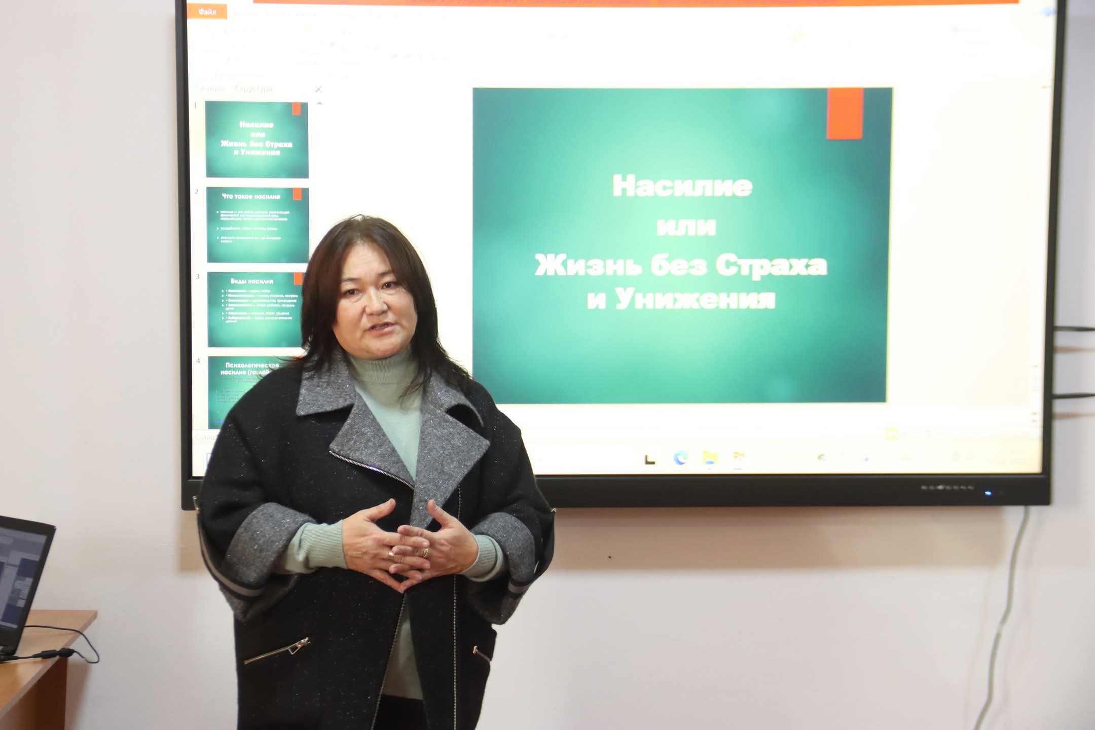 Семинарды Ош мамлекеттик университетинин Педагогика, искусство жана журналистика институтунун психология кафедрасынын окутуучусу Жакыпова Наар Сүйүнбековна өткөрдү. Ал өз сөзүндө үй-бүлөдөгү зомбулуктун себептери, анын социалдык жана психологиялык кесепеттери, ошондой эле виктимдик жүрүм-турумду алдын алуу ыкмалары тууралуу кеңири маалымат берди.